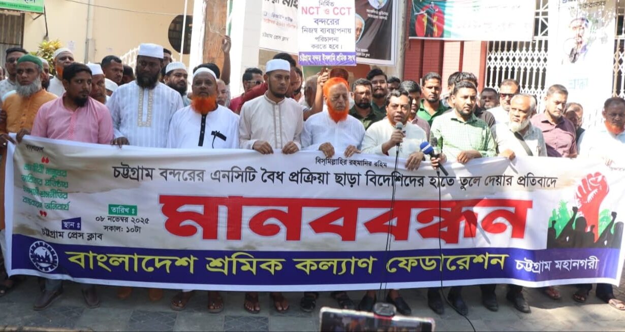 এনসিটি আন্তর্জাতিক দরপত্র ছাড়া বিদেশীদের হাতে তুলে দেওয়ার প্রতিবাদে বাংলাদেশ শ্রমিক কল্যাণ ফেডারেশন চট্টগ্রাম মহানগরের উদ্যোগে মানববন্ধন বন্দরের সাথে বাংলাদেশের…