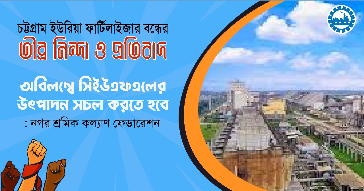 চট্টগ্রাম ইউরিয়া ফার্টিলাইজার লিমিটেড উৎপাদন পুনরায় বন্ধ ঘোষণার তীব্র নিন্দা ও প্রতিবাদ জানিয়েছে বাংলাদেশ শ্রমিক কল্যাণ ফেডারেশন চট্টগ্রাম মহানগর।